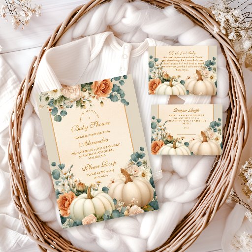 Um charmoso design inspirado no outono, com abóboras de aquarelas moles, rosas de pêssego, verde de eucalipto e flores delicadas de outono. O estilo rústico mas elegante captura o calor da estação, fazer uma escolha convidativa para celebrar a futura mãe.