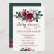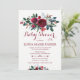 Chá de fraldas floral de inverno moderno e quic com bonito burgundy vermelha e flores brancas de rosas, buquê com ramos sazonais de abeto verde-pinheiro, bagos vermelhos e folhagem e letras brancas. Observe que a cor de fundo é editável em ambos os lados. Você pode alterá-la, assim como a cor da inscrição, depois de selecionar a opção PERSONALIZAR mais. — Ideal para um elegante inverno clássico / chá de fraldas de Natal.