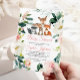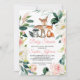 Convite para chás de fraldas de madeira com folhas verdes e rosas cor-de-água cor-de-rosa e um grupo de animais florestais adoráveis