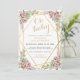 Este convite floral de cor aquosa bonito apresenta flores cor-de-rosa macia com folheto botânico verde e uma moldura geométrica dourada. A parte traseira da placa tem um fundo cor-de-rosa suave com buquês florais cor-de-rosa.