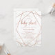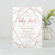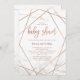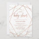 Estes convites contemporâneos para bebês apresentam um fundo de mármore branco e linhas geométricas de ouro rosa falsa para um olhar sujo e moderno.