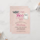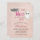 Este convite de chá de fraldas personalizado apresenta um tema bonito para o Dia das Bruxas. Um pequeno fantasma e morcego assustador são fotografados no topo, ao redor do texto "um pequeno Boo está quase vencendo!" Com "Boo" impresso em um padrão brilhante rosa. O fundo é uma cor rosa esmaecida.