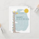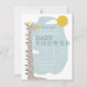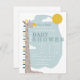 Um convite para o chá de fraldas moderno com ilustração de uma girafa com céu azul, sol e nuvens. O convite tem um esquema moderno de cor azul e design. Personalize o texto.