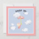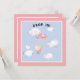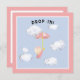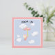 Chá de fraldas convida a menina segurando um guarda-chuva rosa, flutuando nuvens de animais passados.