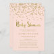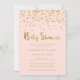 Estes convites para chuveiros de bebês na moda têm um fundo rosa pincelado e suave que dispara o falso confetti de brilho dourado e o falso texto de folha de ouro. Observe que o efeito ouro está impresso digitalmente; o cartão não contém folha de ouro real.