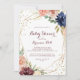 Este convite geométrico para o chá de fraldas de ouro rústico é perfeito para um chá de fraldas moderno. O design apresenta uma aquarela desenhada à mão, púrpura, marinho, pincel, burgundy, flores de marinho, folhas verdes e douradas, brilhando como uma elegante estrutura geométrica.