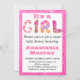 Menina, brilho e doce brilho rosa-quente brilha o convite para chá de fraldas "É uma garota" com a palavra "garota" escrita em doces, rosquinhas, bolo, morango, cupcake. Perfeito para o seu docinho! Adicione facilmente o nome do cheio, a data e a hora do chá de fraldas e o endereço e os detalhes do registro.