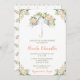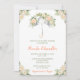 Belo convite para chás de fraldas com um guarda-chuva branco e arranjos florais de pêssego e creme. Perfeito para um chá de fraldas. As palavras podem ser alteradas para se adequarem aos seus próprios detalhes ou requisitos