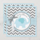 Elefante azul com pássaro empoleirado no ombro e cinza e impressão de chevron branco e arco 3D e fita para um cartão de convite para chá de fraldas de criança. As cores são azuis e cinza.