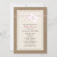 Um convite de chá de fraldas com um fundo inspirado em burlap com design inspirado em renda na frente. Ilustração do gêmeo do padeiro, listrado e rosa, no topo, com "É uma garota". Personalize o texto na frente com detalhes da sua ocasião.