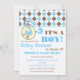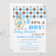 Um convite de chá de fraldas com uma borda superior de argyle azul e castanho com tom azul. Pino de fralda azul conectado à borda superior e forma circular com dentro de carruagem azul para bebês. Personalize o texto azul e marrom com detalhes da sua ocasião.