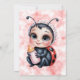 Uma ilustração encantadora de uma menina vestida de joaninha, segurando uma garrafa de bebê rosa e sorrindo doce. A ela se junta uma borboleta colorida com asas de joanilha, acrescentando um toque capricho e mágico. O fundo apresenta bolhas de aquarela cor-de-rosa e macia que dão à design uma atmosfera sonhadora e alegre. Perfeito para temas de chá de fraldas, decoração infantil, ou convites para uma garotinha a caminho.