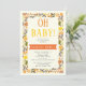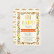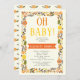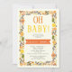 Oh Chá de fraldas, laranja e amarelo, convite na fronteira floral, com a frase "Oh baby" em laranja e amarelo, uma ilustração de uma fronteira floral feita de bonito flores silvestres e folhas verdes de azeitona em fundo de marfim. Texto em preto e branco em uma faixa laranja.