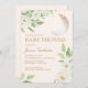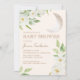 Bonito convite para chás de fraldas com lua crescente reluzente num pano de fundo creme com flores brancas bonito e folhas verdes. Este convite funcionaria bem para um chá de fraldas de menina ou de menino. Entre em contato conosco para obter ajuda com a personalização ou para solicitar produtos correspondentes.