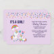 Um convite chá de fraldas com um unicórnio branco com rico colorido cauda e principal. Um unicórnio bebê deitado ao seu lado, com um pacificador verde na boca. Um arco-íris colorido com nuvens lisas, e algumas estrelas e corações decoram este doce e adorável design. Um contorno cor-de-rosa em negrito ao redor da imagem lhe dá uma vibração de rabisco em forma de criança. Pontos de Confetti ao longo do topo.