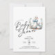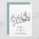 Bonito convite para chás de fraldas com um adorável ganso de mamãe e fofocando. Bonito roteiro escrito à mão para o Chá de fraldas é perfeito para este doce convite. Coordenando o azul empoeirado no verso.Veja os elementos coordenadores em nosso compro, Finch Encantado.
