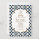 O elegante e belo francês marroquino inspirou convites para bebês com uma matiz de safira azul-marinho repetitiva e um padrão geométrico de design e flores florais de ouro. Este convite de aparência altíssima e luxuosa é perfeito para qualquer chá de fraldas formal, exótico, marroquino, árabe ou aladino com o tema de gênero neutro para um menino ou menina. A parte traseira desses convites personalizados de quadro de rico pode ser personalizada com o nome da mamãe a ser e o nome do evento na forma quatrefoil e na design de aparência de fita impressa. Trabalho de arte e design © Chrissy H. Estúdios, LLC. Todos os direitos reservados.