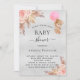 Para um chá de fraldas moderno estilo boho. Um fundo de olhar mal prateado. Decorado com ouro rosa e flores cor-de-rosa, rosas, grama-pampas e ursinha-peluche segurando um balão rosa. Personalize e adicione um nome e detalhes da parte.