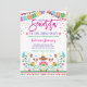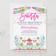Convite para chás de fraldas do tema Fiesta apresentando padrões vibrantes inspirados no México e confete colorido © Blue Bunny Studio