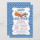 Um convite moderno, ousado e brilhante, para o chá de fraldas desportivo de estrela, com um belo baseball, futebol, bola de futebol, bola de base e taco de baseball. Nossa, é um menino bebê, todos os convidados estelares são colocados em um fundo azul e branco chevron zigzag e têm um retorno correspondente para um toque especial extra. Perfeito para um pequeno chá de fraldas desportivo com tamanhos de estrela