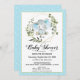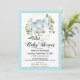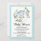 Elefante aquarela em azul e cinza rodeado por prisma geométrica com aspecto dourado com folhagem de eucalipto sobre o chá de fraldas de convite de fundo poka-dot azul design.