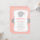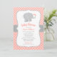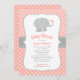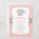 Na moda e doce convite para chás de fraldas apresentam um adorável bezerro de elefante recém-nascido com placas em forma de coração. O design combina um padrão de faixas diagonais clássicas com bolinhas lúdicas e inclui um esquema de cores de cor rosa-coral, pêssego, cinza e branco.