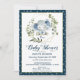 Elefante de aquarela em azul marinho e cinza rodeado por prisma geométrico com aspecto dourado com folhagem de eucalipto sobre design de marinho azul de convite para chá de fraldas de fundo de poka-dot.