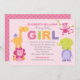 Amigos bonitos da selva de bebês, incluindo um leão, girafa, pássaro, macaco, elefante e hipopótamo, enquadram este moderno e doce convite temático de safari. sotaques de padrão de bolinhas e stripe. Cor rosa, laranja, verde, roxo e cinza. Perfeito para uma menina!
