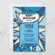 Um divertido, legal e moderno livro de histórias em quadrinhos azul de um bebê inspirado em chás de fraldas, borrifados ou casais, convite para o chá que coloca o wham, zap, pow em qualquer mãe super-herói para ser ou evento de celebração de casais. O reverso apresenta um padrão de bolinhas de quadrinhos azuis correspondente que você pode substituir por sua própria imagem ou foto. Projetado por Thisnotme©