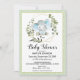 Elefante de aquarela em verde-sábio e cinza cercado por prisma geométrico com aspecto dourado com folhagem de eucalipto sobre o chá de fraldas de convite para design de fundo poka-dot verde-sábio.