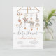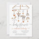 Convites modernos e fofos de bebê Circus. Scandinávia excelente com elefante, forte, mestre do anel, cavalo, foca, arco-íris, nuvens e estrelas penduradas em um celular. Esquema de cor neutro para ser um menino ou uma menina. Terra cotta, cinza azul empoeirada e branca.