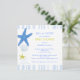 Starfish, branco e com casca de mar com listras em azul-bebê desenhadas em Baby Shower Invices personalizadas. Excelente de design com tema de praia único e doce para a sua festa de chá de fraldas de verão! Todo o texto de amostra pode ser totalmente personalizado com sua própria redação. Sinta-se livre para alterar as fontes, tamanhos e cores do texto também.