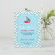 Ahoy! É um menino! Convide amigos e família a navegar sobre e comemorar a chegada de seu bebé pequeno do marinheiro com este convite náutico elegante e elegante do chá de fraldas! Tem um veleiro pequeno bonito com uma vela do teste padrão colorido das listras e uma estrela em seu conselho. Uma paleta de cor de vermelho, de branco, o azul e um fundo azul e branco da viga, este convite é perfeita para um partido náutico do tema para bebés! Personalize facilmente com seus detalhes do partido.