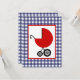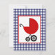 Um convite de chá de fraldas com uma ilustração de uma carruagem vermelha de bebê sobre um fundo de gingham azul. Personalize o texto com detalhes da sua ocasião.