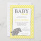 Uma ilustração fofinha de elefante para bebês é mostrada neste doce convite de chá de fraldas neutro em gênero. Mostrada em cinzas, amarela e branca. Trendy e único! Gráficos © www.scrappindoodles.com