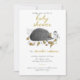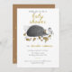 Montes modernos minimalistas personalizados e personalizados de capuz de madeira de ourivesaria coleção de chás de fraldas em folha de ouro, para uma celebração de chá de fraldas fofa, caprichosa e semelhante a conto de fadas, para um bebê ou uma menina. Possui um ouriço bonito com uma pequena coroa, cercado por peras amarelas maduras, num dia frio de outono. Convite para chá de fraldas temático de animais florestais do outono. Convite para chá de fraldas de orçamento Hedgehog