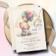 Um bonitinho urso de pelúcia fofinho segurando um monte de balões e as palavras "Nós podemos esperar muito..." junto com os detalhes do seu partido são apresentadas neste convite para chás de fraldas neutro em relação ao gênero. CORRESPONDENTE a itens na nossa coleção.