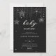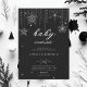 Modelo de convite de festas moderno, elegante e isento de gênero quic, apresentando um fundo preto texturizado, brilho, a palavra BABY e flocos de neve desenhados à mão cobertos por rochas (não rotinas reais, este é um efeito digital), tipografia moderna. Uma design chic, eterno para uma futura mamãe que comemora seu chá de fraldas nos meses de inverno, novembro, dezembro ou janeiro ou mesmo além, enquanto houver neve!