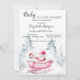 O convite para chás de fraldas bonitos mostra a floresta de inverno com o Papai Noel, e o boneco de neve com trenó rosa. Esses convites para chuveiros de bebês são facilmente personalizados para seu evento simplesmente adicionando seus detalhes.