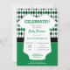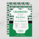 Um padrão elegante e sobredimensionado de estilo nas cores escolares de verde e preto é o pano de fundo para este design chá de fraldas bonito. Uma roupa branca para bebês tem todo o texto escrito nela para o grande evento, que pode ser um chá casal ou apenas para a mãe. O design vem em marrom e cinza, laranja e cinza queimadas, vermelho e preto, verde e preto, laranja e marinho, verde e amarelo, roxo e cinza. Produtos correspondentes disponíveis.