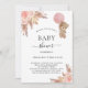 Para um chá de fraldas moderno estilo boho. Fundo branco na frente. Decorado com ouro rosa e flores cor-de-rosa, rosas, grama-pampas e ursinha-peluche segurando um balão rosa. Personalize e adicione um nome e detalhes da parte. Fundo: Um fundo metálico rosa dourado, pincelado, pincelado, pincelado, falho rústico e roxo.