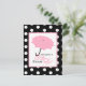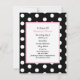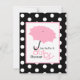 Um convite para chás de fraldas de meninas apresentando uma ilustração de um guarda-chuva rosa sobre um fundo de preto com bolinhas brancas. Personalize o texto com detalhes da sua ocasião.