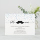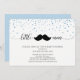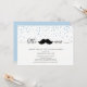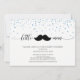 Pequeno homem moderno e minimalista bigode rapazes chá de fraldas com uma letra moderna caligrafia manuscrita, adornada com um borrão de luz azul confetti