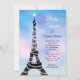 Luzes cintilantes acenam a Torre Eiffel em um fundo cor-de-água rosa e azul, fazer este convite para chás de fraldas parisiense perfeito para a festa inspirada em Paris.