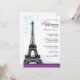 Os convites parisienses elegantes e modernos do chá de fraldas com uma torre Eiffel da cinza-escala sobre uma beira inferior roxa com azul do aqua florescem atrás dele.