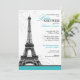 Convites à Turquesa: O elegante e moderno Baby Shower parisiense convoca com uma Torre Eiffel em escala de cinza sobre uma borda de baixo de turquesa com cinzas de luz voando atrás dela.