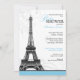 Convites azuis: O elegante e moderno Baby Shower parisiense convoca com uma Torre Eiffel em escala de cinza sobre uma borda azul inferior com cinzas de luz voando atrás dela.
