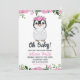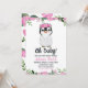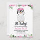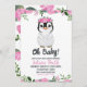 Este convite apresenta um pinguim bebê bonito vestindo uma faixa floral rosa. Um tema adorável para o pequeno pinguim a caminho!