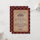 Um convite de chá de fraldas com ilustração de um bebê urso em posição de dormir no galho da árvore. Personalize o texto. O fundo é vermelho e a xadrez preta de lenhador inspira o padrão de xadrez de búfalo.
