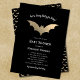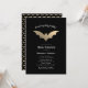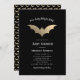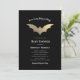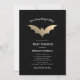 Um taco de folha de ouro legante sobre fundo preto faz com que o convite para chá "Vamos Batty para o Bebê!" se destaque. Padrão de batida atrás. Veja a coordenação de itens no nosso compro, Encantado Finch.